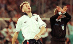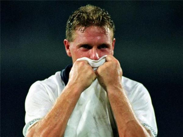 They did it though, admittedly with just ten minutes remaining. Parker, nicely atoning for his ‘mistake’ of before, hoisted a long ball from the left-wing forwards, and Gary Lineker controlled the ball beautifully, his touch managing to drag it away from the two German defenders on him and across to his left foot, with which he belted it past keeper Bodo Ilgner and into the bottom corner. 1-1. England’s striker supremo had done it again, and his celebration (arms aloft, fists in the air and head rocking back with pure relief and exultation crossing his face) said everything. And so extra-time came. The most memorable moment of which, and the entire match’s third most memorable, being when Gazza went heavily into a mis-timed tackle against midfielder Thomas Berthold and was booked – his second in the tournament after being shown a yellow card in the match against Belgium. In this World Cup, two bookings accrued in separate games – even if they were in separate rounds – ensured a player would miss the next match, meaning that Gascoigne would automatically miss the final, should England get there. And then it happened, Gazza’s waterworks; the image for which he’s most remembered, one of modern football’s most recalled images. His bottom lip trembling and the tears falling, the player was inconsolable and the TV cameras brilliantly captured Gary Lineker observing his teammate and gesturing to the bench that someone needed to ‘have a word with him’. Yes, Gazza was out of the final, but less than 20 minutes later, so were England themselves.