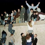 Hello, goodbye: Italia ’90’s logo (left) and mascot, Ciao (centre left); the Berlin Wall is felled (centre right); and the Poll Tax riot rages in Traflagar Square as Thatcher finally goes (right)