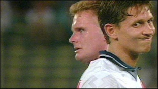 Yes, Gazza. It’s very difficult to imagine a time when the clown prince of football from up there in Geordieland wasn’t a part of the English (and wider British) consciousness, but before this tournament, he was just a useful midfielder who had come down south and played for Tottenham Hotspur. He wasn’t particularly well known at all. Like Platt, he’d made only a handful of appearances in a national shirt before this tournament, but he exploded like a bright, brilliant lightbulb of ebullience as England progressed through it. And yet, that mostly wasn’t because of his footballing prowess. It seemed more so (especially for me) because of his irresistible personality; a tubby, bubbly barrel of fun that was far more the joker in the class – his practical jokes were in evidence seemingly whenever TV sport reporters interviewed anyone in the ‘England camp’ and surely did much for the team’s morale and relaxed spirit – than a football king-in-making. He seemed a bit like the team mascot whom they let play because he was lucky for them – indeed, many misconstrued why he stuck his tongue out at the camera during the national anthem at the start of each match, assuming it was a cheeky greeting to the audience back home; it was actually a good-luck charm he’d adopted.