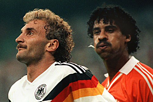 The game was feisty from the start, with unnecessarily strong tackles going in all over the shop, but the real farago began when Rijkaard fouled Völler and a free-kick was awarded the Germans around the midway point of the first-half. The former player followed this up, bizarrely, by spitting in the latter’s hair; Völler made a big show of complaining about it to the referee and, for his troubles, got booked along with Rijkaard. Then, as the free-kick was taken, Völler dived theatrically in the hope of winning a penalty; it wasn’t given, but an unimpressed Rijkaard proceeded to twist the German’s ear and stamp on his ankle and, perhaps understandably, Völler squared up to him. The referee was having no more and gave them each another yellow card – they were both sent off. However, that wasn’t the end of it. As they walked off, the German slightly ahead of the Dutchman, Rijkaard demonstrated what he thought of Völler once more – by spitting in his hair again. Having suffered this indignity a second time (and it was an indignity too, as the home broadcaster needlessly showed a slowed-down replay of the unsavoury moment, saliva in Völler’s horrible blond perm and everything), Völler looked appealingly to the ref, but to no avail given he’d already been dismissed from the pitch.