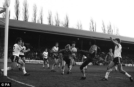 Giddy heights: Ronnie Radford and friends feel as high as a steeple as the Hereford United midfielder (wearing number 11) scores against Newcastle and triggers a pitch invasion