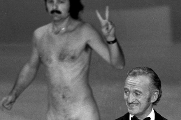 Bare-faced cheek: Niv sees the funny side as a chap in his birthday suit joins 74’s Oscar party