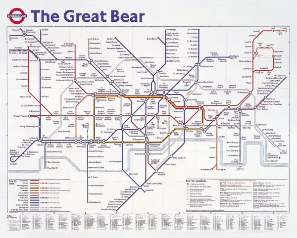 As with any artwork, though, there’s something more profound at work with The Great Bear than just giving the viewer a decent chuckle. By not just retaining the look and iconography but the exact detail of the Tube map, yet substituting the expected and often familiar station names for names of well-known figures from completely different realms of our experience, it creates a slightly jarring, even confusing effect. Although this effect may only be there for a few seconds until we figure out what’s going on and it becomes funny, it’s long enough to lodge in the brain and, thus, cleverly demonstrate how the everyday and the expected can be subverted – how peculiar it is when the entirely disparate (film actors, philosophers, engineers etc) are brought together in one setting where they shouldn’t be (the Tube map). It’s all about knocking us sideways and looking at the familiar through different eyes. It’s a smarty-pants artwork to the say the least, methinks.