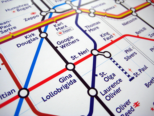 Taking a perhaps less expansive but no less lofty theme – that is, the works of the Bard and the connections between the different characters of his plays – is the Greater Shakespeare map. A recent publicity tool produced by Stratford-on-Avon’s world famous Royal Shakespeare Company (RSC), it’s a fun and very accessible PR exercise for their theatrical efforts and the genius of the great man himself; the contours and colours of its lines and the font of its stations/ character names unquestionably Tube map-esque.