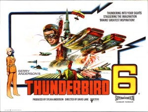 Two hugely popular ’60s British kids’ telly shows transferred to the big screen here and done so with the aid of a pair of stonking posters. The first is simple as you like, but effective as hell. What I love about it is that it leaves you in little doubt as to who the main draw is – and it’s not Who (as he was here, not ‘The Doctor’ as in the Beeb’s classic still-running series); yup, it’s unquestionably those pesky tin-pot scallywags from Skaro, the Daleks. If you were at all unsure from the main image – how could you be, they’re enormous compared to the human characters on the extreme left? – then the size of the font that the word ‘Daleks’ in the title is given absolutely rams home the message. The Thunderbird 6 poster is (perhaps sad to report) air-miles and air-miles better than the actual film it promotes. Honestly, the flick itself possesses none of the style, dynamism and downright cool of this image. Mind you, like its poster, it does have both Lady Penelope and Parker in it, which is something at least, I guess.