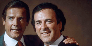 Terry quit Blankety Blank the year before he finished on Radio 2, to be replaced as host by comedian Les Dawson. As it was now the ’80s, perhaps inevitably he moved on to the abundant TV variety show of the age: the chatshow. The first he fronted was BBC1’s Saturday evening effort What’s On Wogan? (1980), which although only boasting a single series gave him an important grounding in the format and led to 1981’s one-off Saturday Live, on which he interviewed Larry Hagman aka JR Ewing in Dallas (1979-91).