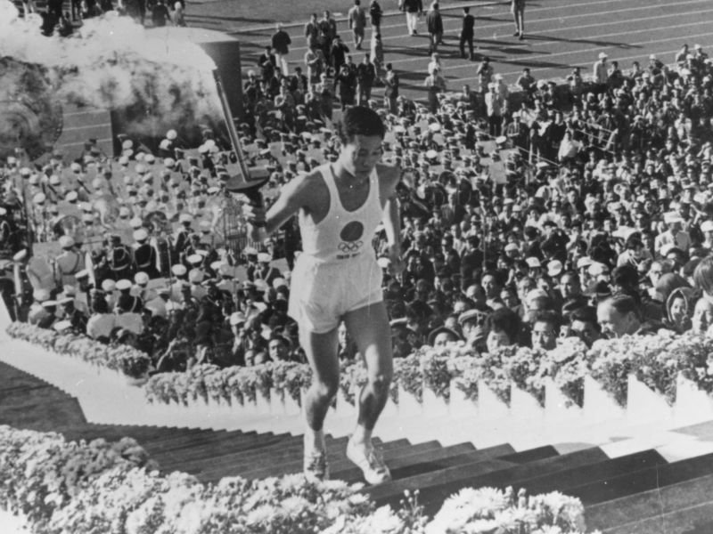 The land of the rising sun rises again: the ’64 Summer Games in Tokyo – a statement of Japan’s return from the wilderness – begins as torchbearer Yoshinori Sakai reaches the cauldron