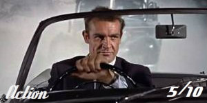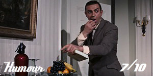 Being it’s maybe the wittiest of all Bond films, Goldfinger is easily one of the funniest – humour is the order of the day pretty much throughout.  As mentioned, 007 gets to deliver some of his most delicious lines of the series (when Oddjob doesn’t open a door for Pussy: “Manners, Oddjob, I thought you always took your hat off to a lady”; on Goldfinger’s horse: “Certainly better bred than the owner”; on his car’s ability to track targets: “Ingenious, and useful too – allow a man to stop off for a quick one en route”). It’s also replete with some of the series’ best visual gags, what with the little old lady who stops baking to operate the Swiss factory’s gate only to turn out to be a machine gun-toting first line of defence and, of course, the nuclear bomb’s timer in the finale stopping exactly on ‘007’. The oh-so appealing facet of the Bond films laughing at themselves, which would run throughout the rest of the series, properly began here.