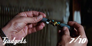 When it comes to gadgets – and, well, the wider film itself – Thunderball‘s tone is set right from the off when Bond throws on his conveniently placed Bell Texton jet-pack and flies away from his pursuers. It’s cool, no question, even if the mop-top haircut-style helmet 007 has to wear when using it is not. A more practical and better gadget though is the natty mini-breather he can use if he has to abandon conventional underwater breathing equipment at any point (which, naturally, he does). In fact, it’s a gadget-and-a-half. Bond also uses a swallowable homer pill, an underwater camera with infra-red film and in-built geiger counter, as well as an underwater propulsion unit, which boasts spear guns and searchlights, but perhaps the less said about that one the better.