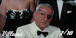 You might think that with such a strong story, Russia isn’t the most action-packed Bond film and you’d be right, so why the 8/10? Because it possesses arguably the best fight in the entire 007 canon. ‘Bond versus Grant’ is a full-on, all-out, blue light-dawbed, sometimes sound effect-enhanced, no-holds-barred brawl in a train carriage compartment. It’s so visceral that it comes as something of a shock given it both appears in a PG-rated ‘family friendly’ flick from the early ’60s and alongside the comparatively pedestrian action to be found elsewhere in this flick. That includes a gypsy camp battle set-piece halfway through the movie and a speedboat chase in the finale, the latter of which (as a Bond film action climax) has always disappointed me, must admit.
