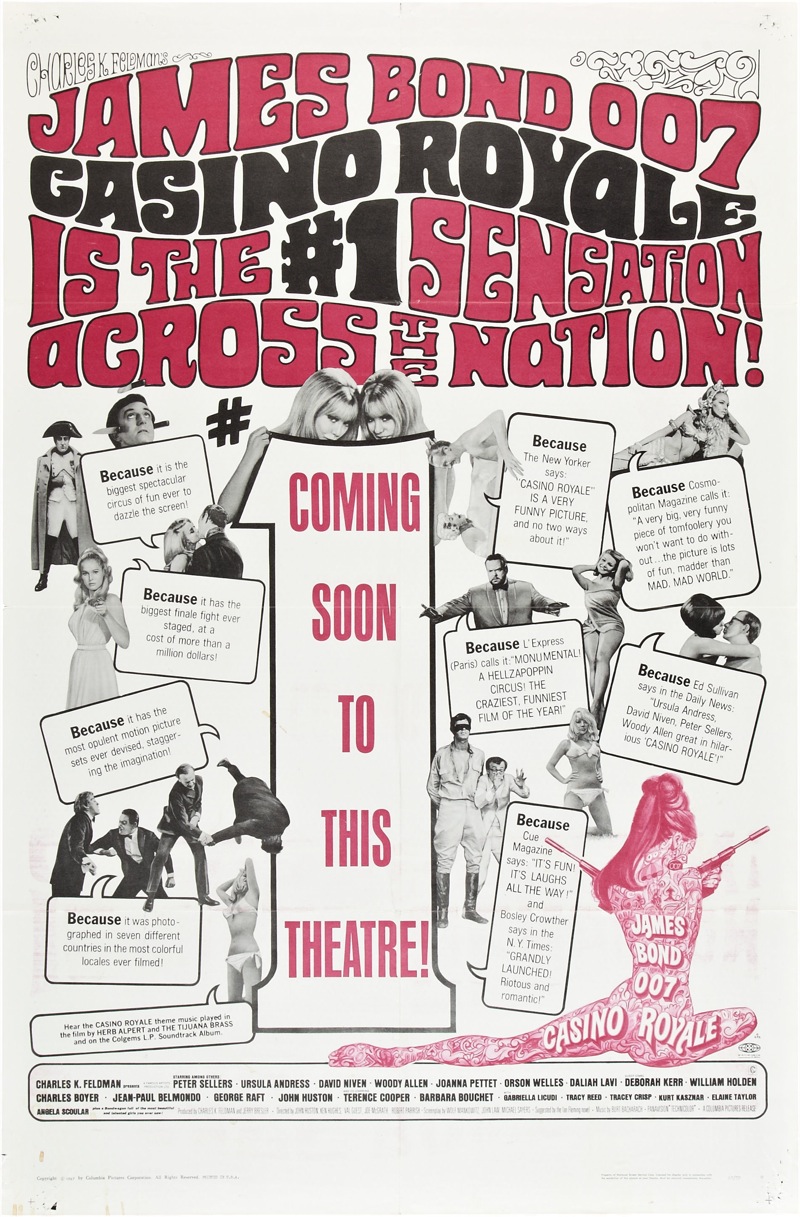 If you’re at all like me and have ever bothered to sit through 1967’s Casino Royale, the so-called comedy pastiche of all things Bond, you probably concluded as soon as its closing credits, well, closed that that’s two-and-a-bit-hours of your life you’re never getting back. But, again, if you’re at all like me you may also have wondered after watching said flick, just how on earth such a star-packed, dazzlingly looking and beautifully scored, but most of the time incredibly crap, and yet at other times rather amusing grand disaster of a movie ever got made in the first place? And how, coming practically slap bang in the middle of the mid- to late ’60s ‘Bondmania’ of the Connery 007 era, it fared at the box-office?