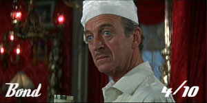 Where to start? Given so many characters in Casino Royale are ‘James Bond 007’ we could be here all day. For the sake of brevity and sense though, I’ll focus on just two: David Niven’s real Sir James Bond and Peter Sellers’ Evelyn Tremble, the film’s most featured and obvious Bond stand-in. Niven’s Bond is actually rather engaging and interesting. A distinguished elder English gentleman and yet world-weary (he still hankers after real-life WWI-era spy Mata Hari whom he sent to a firing squad), this may be no Fleming’s 007, but allows Niven to show-off much of the charm, wit and quiet heroism of many of his best roles; think Phileas Fogg in Around The World In 80 Days (1956). But, again, this isn’t Bond – and Sellers’ Tremble certainly isn’t either. He’s also charming and witty, but owing to script problems – and Sellers’ own – an inconsistent creation, whose role in the narrative (like so many others’) doesn’t altogether make sense.