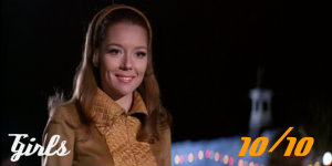 Is there a stronger Bond movie when it comes to girls than OHMSS ? You’ll be be hard pressed to find one. Why? Mostly because it features the series’ best female character, Diana Rigg’s Tracy. Nowadays, it seems every latest Bond Girl actress suggests hers is the match of 007, when patently none have been – apart from Tracy, who in almost every way was. Smart, witty, glamorous, resourceful, tenacious, cunning, a strong skiier, an excellent driver at speed, useful in a fight, as well as appealingly glass-half-empty and, of course, beautiful in a refined, elegant way, Tracy truly is terrific. Add into the mix her melancholic doomed fate (à la Vesper in Casino Royale) and she has to be top of the Bond Girl Christmas tree. Yet, OHMSS is surely the ultimate for Bond Girls because she’s not its only one. For who could forget Blofeld’s ‘Angels of Death’? The dozen or so Swinging lovelies hypnotised atop his Alp, whom unwittingly will do his bidding once back home. They’re all beautiful and good value, but the main duo, Angela Scoular’s Ruby and Catherine Von Schell’s Nancy are both delicious, so much so that Bond, despite his real romance with Tracy, can’t help but indulge in their delights – oh, the things he does for England…