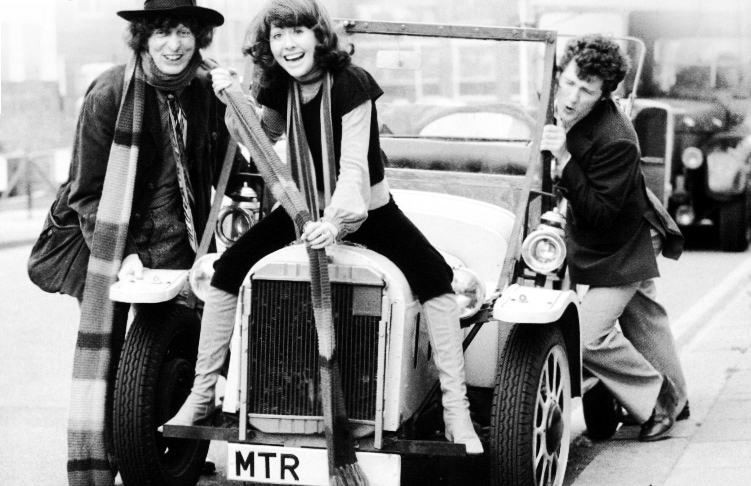 Tom, Liz and Harry: Baker and Sladen play around on Bessie with fellow companion actor (from Baker’s opening two seasons) Ian Marter, who played UNIT physician Harry Sullivan