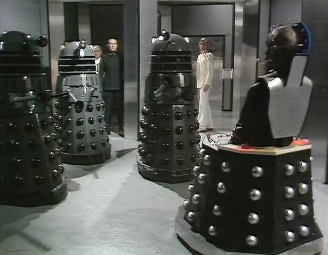 Unexpectedly, but not to The Doctor’s surprise, Daleks suddenly enter the Thal dome (clearly on Davros’s orders – he obviously intended the Thals to destroy much of the Kaleds’ home to prevent his Dalek project being halted) and murder the Thal population. The Doc and Bettan manage to escape and, having made it back to the bunker and finding Sarah, Harry and Sevrin have survived the rocket strike, he suggests Bettan joins Sevrin to bring the survivors together in a concerted effort against Davros and the Daleks. He, Sarah and Harry are swiftly captured by Davros and Nyder, however, and the humans tortured until he spills the beans on all the Daleks’ failures to come, so Davros might address these weaknesses and ensure they’re invincible.