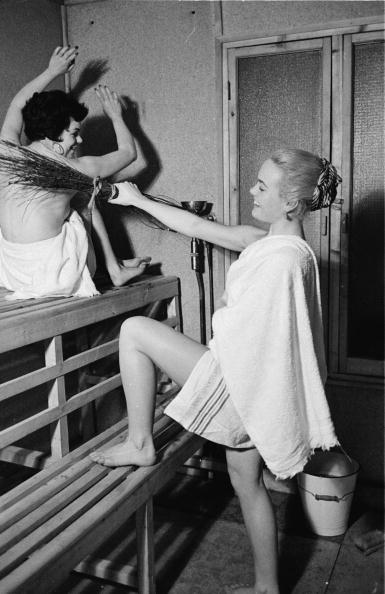 5th June 1954: Actress Shirley Eaton beating Rachel Roberts (1927 – 1980) with a bundle of birch twigs to encourage perspiration during a visit to a sauna in the classy London borough of Kensington. Original Publication: Picture Post – 7175 – The Sauna Comes To London – pub. 1954 (Photo by Haywood Magee/Picture Post/Getty Images)