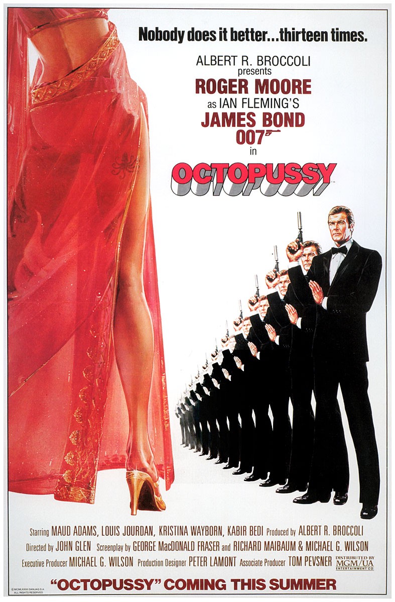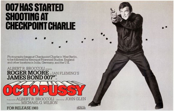 Octopussy, the Bond flick that, more than any other, harbored hard-nosed Cold-War aspirations, was the series’ first to offer up a truly ‘super advance’ teaser poster a whole year before it opened, in the shape of the effort on the left. With a background daubed in almost Berlin Wall-like bland grey and featuring a practically outfitted and troubled, nay anxious-looking 007 (rare in the Moore era – not least on his posters), it’s nonetheless dynamic stuff, informing audiences the movie’s excitedly just started filming at Berlin’s notorious Checkpoint Charlie, with Bond shooting at an unseen opponent whom appears to have let off several shots at our man – and nearly hit him. The message is clear: this Bond movie means business. Meanwhile, a later teaser poster (right) for some inexplicable reason plays up the fact Octopussy will be the series’ 13th by showing a full 13 Rog’s up against the titular Bond Girl. Is it effective or just a bit odd? Good question (which could be asked of the movie itself), but it’s certainly memorable.
