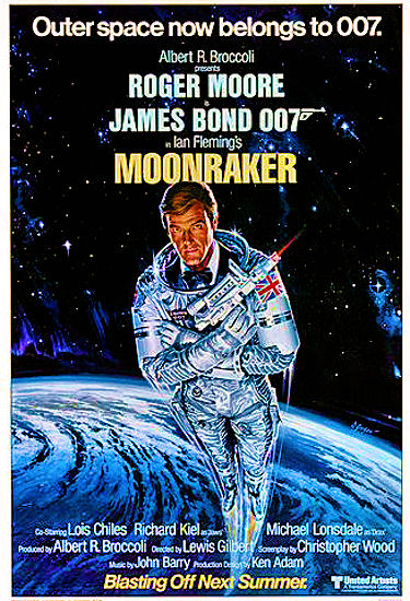 In 1975, so the legend goes, the phenomenon of the summer blockbuster was born with the release of Jaws – and was only consolidated by the even bigger release of Star Wars two years later. From then on Hollywood studios fell over themselves to outdo each other with bigger and more bankable adventure blockbusters-to-be each summer – and naturally Bond slipped as comfortably into this bracket as does his Walther in its shoulder holster. Eon and Bond studio United Artists were obliged to follow the new summer blockbuster marketing trend and unleash advance posters earlier than ever before for their latest 007 epics and Moonraker’s teasers (and the movie itself) is a prime example of this. Released in early ’79, the main advance poster (left) for the unashamedly Star Wars-influenced sci-fi fantasy not only leaves the viewer in absolutely no doubt Bond will, yes, enter space, but also informs them he’ll be ‘blasting off next summer!’. Talk about whetting the appetite months and months in advance. Which is a moot point because the alternative teaser for the US market (right) totally fails to do that; frankly, it’s dull as dishwater – even the Moore imagery’s borrowed from the Golden Gun campaign of five years before.