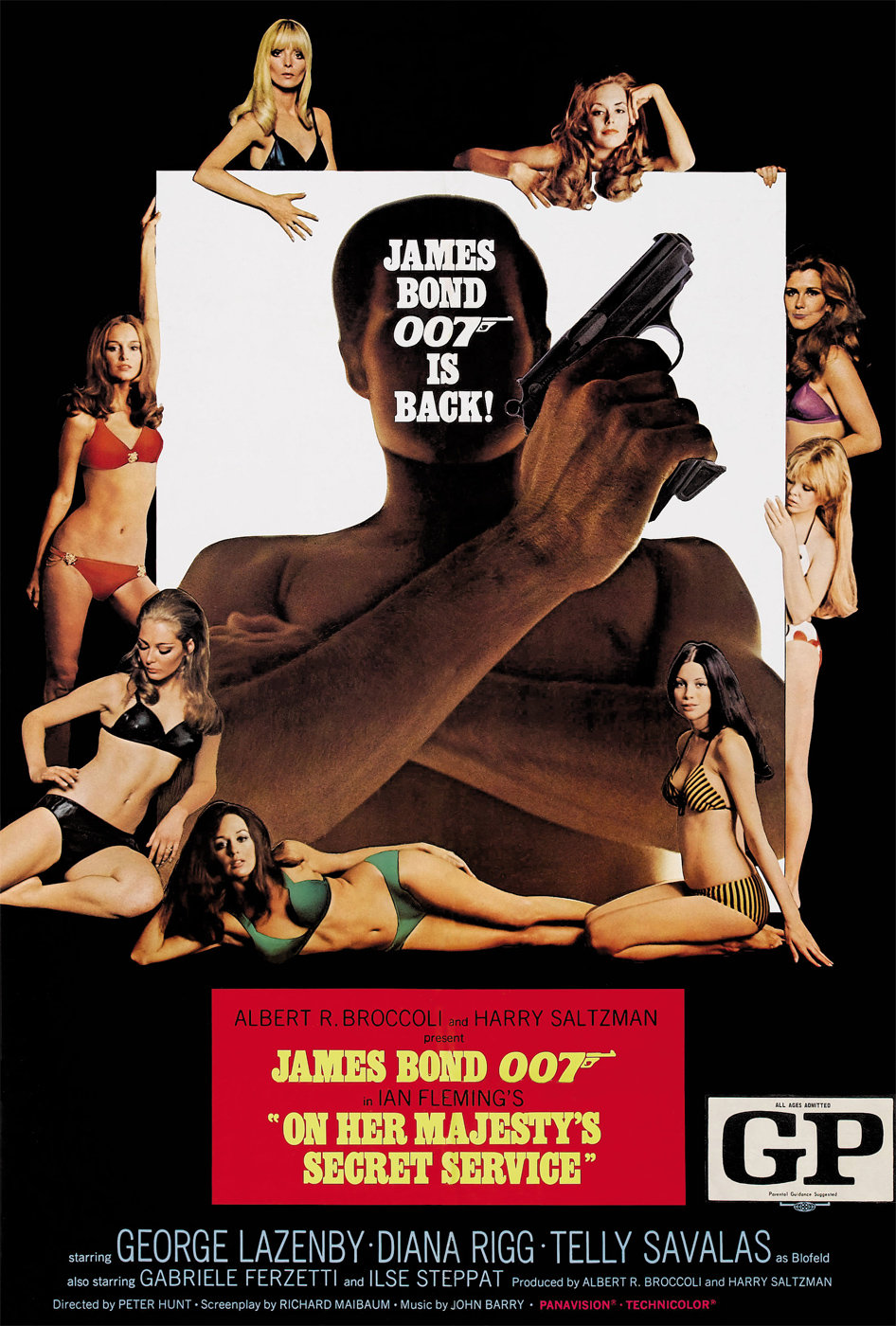 Faced with the quandary of, for the first time, having to sell a Bond film without Sean Connery, the Eon marketing machine took the interesting decision with the advance poster (left) for On Her Majesty’s Secret Service to, er, ignore altogether the fact there was a new actor. Not only does new boy George Lazenby not even get a mention before the bottom of the poster (his name can be found down there among the detritus of the flick’s principal credits), but also his face at the centre of the poster is entirely obscured by the legend ‘James Bond 007 is back!’. Perversely, this merely exaggerates the fact Connery’s absent and a new no-name’s filled his Saville Row duds. Matters too aren’t helped by the image giving the impression the new Bond’s some sort of muscle-man-giant with an eerily enormous right hand. Even more interesting is the concept art on the right, which was created but ultimately not used for the teaser poster campaign. Again, it’s focused not on selling the new star-in-waiting but the unique content of this 007 film – Bond and his bride-to-be. It’s also fantastic, pop art-like monochrome photography work.