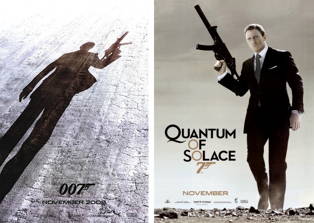 The teasers for Royale’s sequel Quantum Of Solace said less of what was to come in their movie than did the teaser for the former flick – but, one might argue, like Tomorrow Never Dies’ teaser following GoldenEye’s, they didn’t necessarily need to. Again, like Tomorrow, Quantum is a movie all about consolidation; a new direction, a new Bond and sating an audience wanting more of that. So much so that both Quantum teasers echo the final scene from Royale – 007 holding aloft a bloody big gun having finally got the best of an elusive baddie and having finally ‘become Bond’. In doing this, the best of the two is the first (left), which whets our appetite by merely showing us the silhouette of Bond with his gun on a hard, broken (back)ground. The second – and later – poster (right) repeats the theme, this time with our hero walking towards us and alongside it the film’s title in its official typeface (which, again, echoes that used for Royale). So, effective? Yes, both are. But a bit one-note and underwhelming like their movie? Again, yes. Really, its a pity we didn’t get something more original like this fan art attempt.