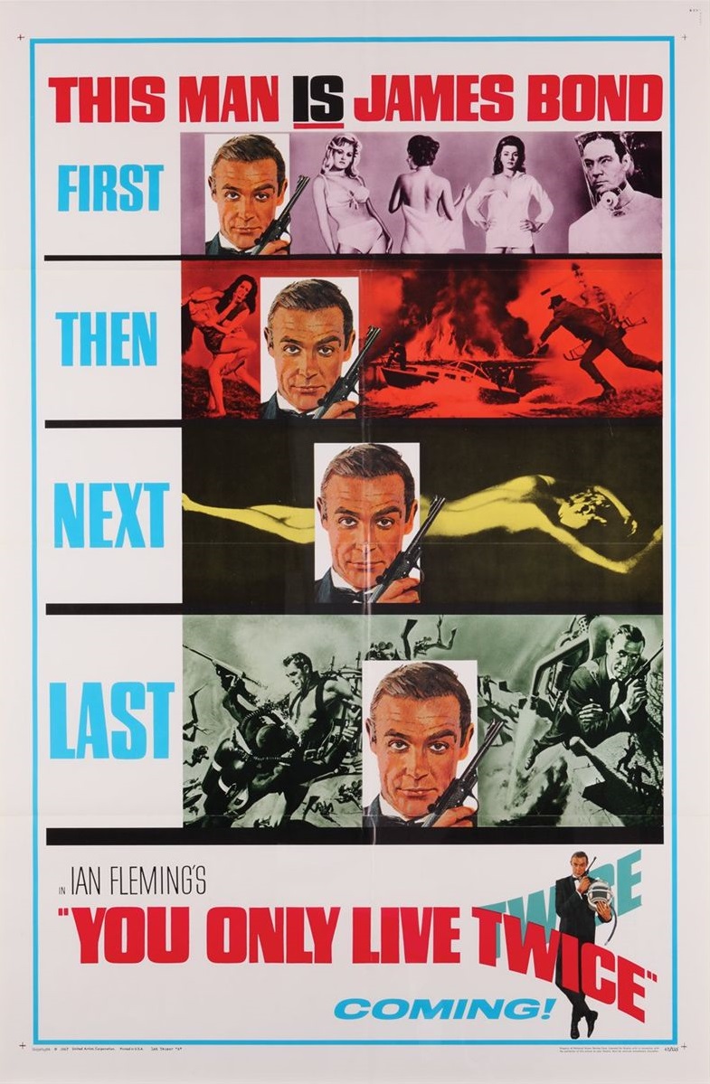 Sleek, smart and oh-so efficient, You Only Live Twice’s advance effort perfectly reminds cinemagoers of what they’ve already enjoyed from Bond (specifically, detail from posters of his previous four adventures – cleverly tying them in with that ever increasing-in-size marketers’ dream that’s Connery’s mug), until at the bottom delivering the next film’s title in the terrific typeface-image-combo that’ll adorn the main posters to come. If this didn’t bait your breath for Bond in ’67, nothing would have – ‘Coming!’, indeed!
