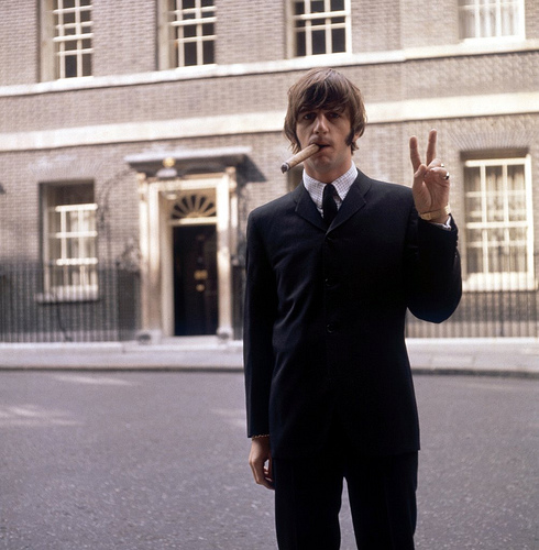 Close and some cigar: Ringo shows who’s boss as he poses in front of 10 Downing Street with a big fat stogy at the height of his Beatles fame
