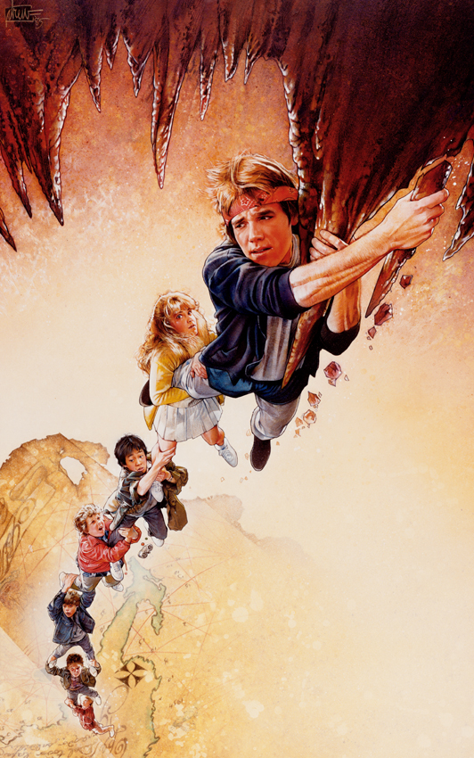 Like I said at the top of this post, a Drew Struzan poster is instantly recognisable. That airbrushed background giving the thing a pleasingly smooth, almost glossy appearance, while the portraiture (although excellently detailed) tends to err on the comic book-esque. Most admirable of all, though (and probably the mark of the greatest poster artists), the composition of his works are always dynamic, often fantastical and usually unforgettable. Take for example, the awesome perspective conjured up by the cast of The Goonies (1985) desperately hanging on to each other’s ankles, or the irresistible iconoclasm of the principal players of the Back To The Future trilogy (1985-90) checking their watches in bemusement as they step out of the time-travelling DeLorean. Quite simply, nothing evokes Hollywood fantasy and/ or adventure like a Drew Struzan poster. It’s that simple.