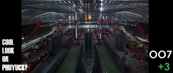 1.17.30: Bond goes spy-fi for the first time here – Ken Adam’s ace subterranean rocky walled-tunnel daubed in pink light and giant bronzed submarine-like door.